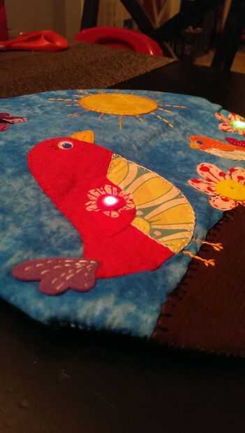 Finalmente, decidí que quería algo para encubrir el LilyPad y de mi y para protegerlos de frotando uno contra el otro. Así que cortar otro círculo de 12 pulgadas de fieltro rígido y utilizan piezas pequeñas (1/2" cuadrado) de Velcro (encolada) para unir esto a la parte posterior de mi proyecto.