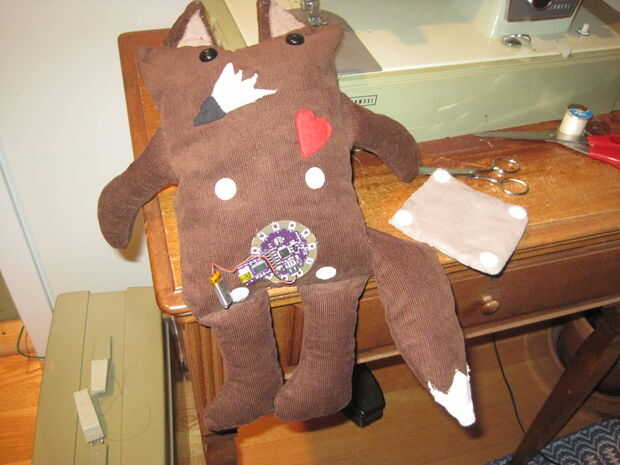 Para una clase sobre tecnología en bibliotecas, tenía que crear un proyecto que utiliza LilyPad Arduino y decidí crear un animal de peluche que canta "Jesús ama a mí", mientras luces flash con las notas. Hice un zorro, pero el patrón que te enlazo puede utilizarse para hacer un mapache así.