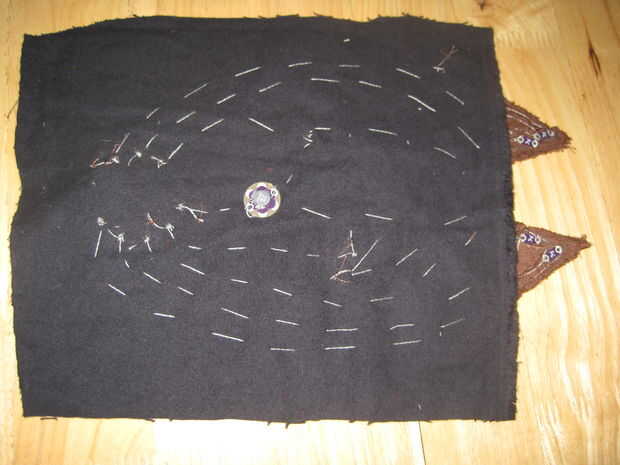 1. Tome un pedazo grande de material de desecho y corte para que sea del mismo tamaño que la pieza de cuerpo. Los pines juntos. Coserá la placa Simple de LilyPad Arduino, así como los LEDs de la pieza frontal del cuerpo, pero se coserá el hilo conductor que va a conectar en el material de desecho que respalda la pieza frontal del cuerpo, y el zumbador que se reproduce la canción se unirá al material de desecho.
