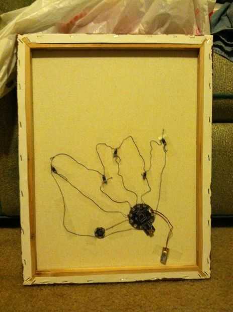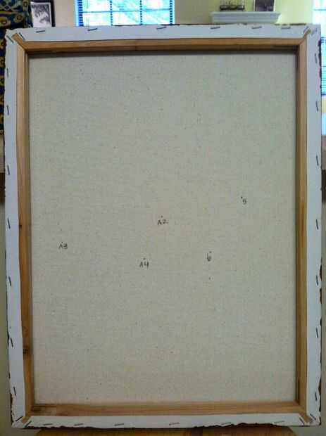 Ya que no tengo ni idea de coser, yo simplemente puso a todos de mi hilo y luego una vez que tenía todo en su lugar, lo había grabado en la parte posterior del lienzo. No es la más bonita en la espalda, pero funciona y nadie lo verá una vez que cuelga en la pared! Hice asegurar de cada línea a través de los agujeros varias veces para asegurarse de que hay una conexión y con cinta hacia abajo para evitar que se cruce.