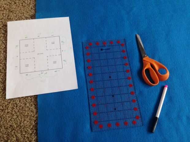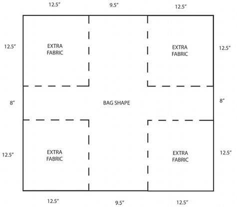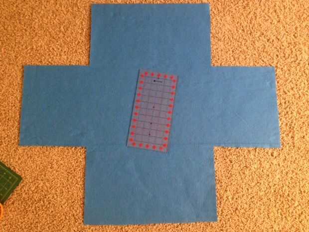 2. trazado con un palillo de la yarda las medidas de mi maleta y corte a lo largo de mi línea de puntos para obtener la forma de cruz que ves en la imagen de abajo. La parte posterior de la aleta inferior de la bolsa era la superficie que iba a coser mis peces decorativos del arco iris (también conocido como el frente de la bolsa).