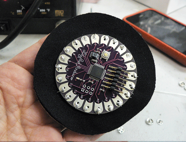 la Plataforma electrónica de LilyPad es una plataforma electrónica diseñada para fácilmente ser cosido en tela mediante hilo conductor, que ofrece a los diseñadores libertad al método de construcción tradicional de soldadura. La LilyPad consta de 3