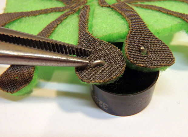 Si está conectando lo plano a algo, doblar las almohadillas hacia atrás para coser a través de ellos y anudar el hilo conductor de las almohadillas conductoras.
