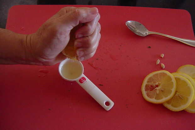 Mientras que el pollo está dorado mezcle los demás ingredientes (excepto las rebanadas de limón). Póngala a un lado.