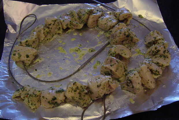 Pase los cubos de pollo en los pinchos. Colocar en un pedazo de papel lo suficientemente grande para todos los pinchos.