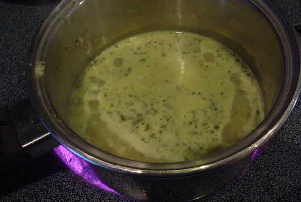Añadir la 1/2 C de caldo de pollo (o caldo de pollo de 1/4 C y de vino blanco 1/4 C)