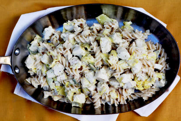 7. Escurra los fideos, luego mezcle con el pollo, alcachofas y salsa.