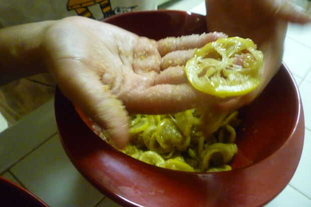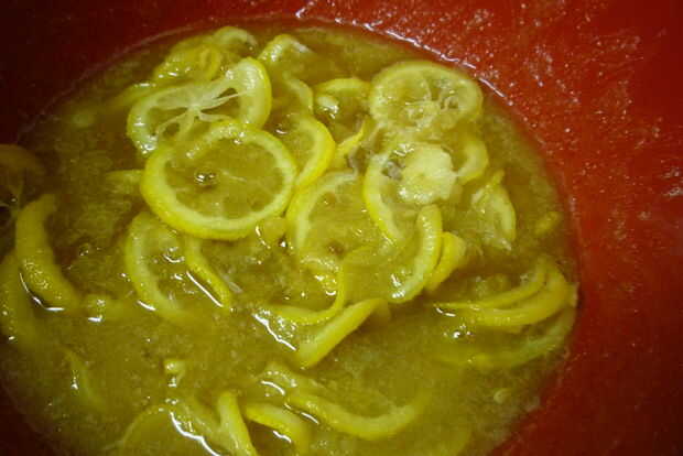 4. en un tazón, mezclar el azúcar blanco y marrón y tirar en los limones.  Con manos cubren las rebanadas de limón forma pareja con azúcar.  Quieres ser lo suficientemente suave para no rasgar los limones como haces esto.  Se trata de una mezcla de jarabe-como.