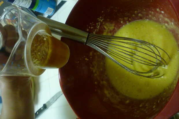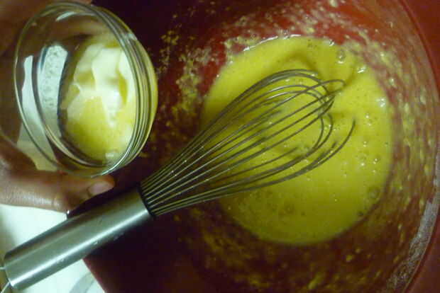 2 en un bol batir juntos los huevos, harina, paquete de gelatina, mantequilla derretida.  Añadir el jarabe de limón.  Agregue esta mezcla sobre la corteza y limones.