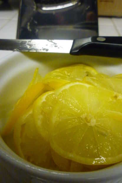 2. extraer un limón en un momento del congelador y debido al limón parcialmente ser congelado llevará a cabo su forma mientras se está cortando. Corte "rodajas de papel" o tan delgado como sea posible.  Las láminas serán see-through-ish. Deshágase de todas las semillas o guardar para la siembra.