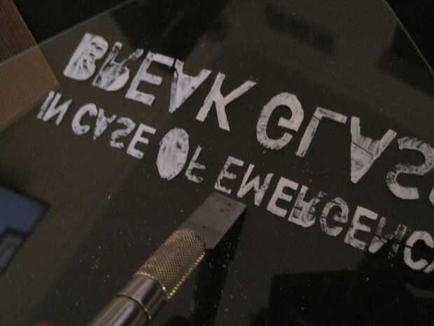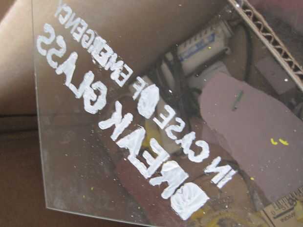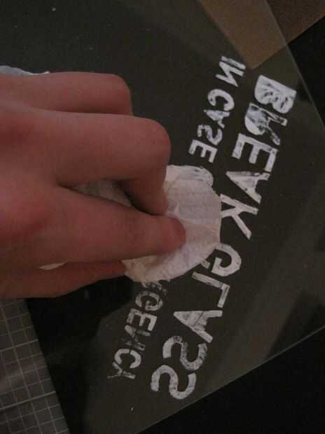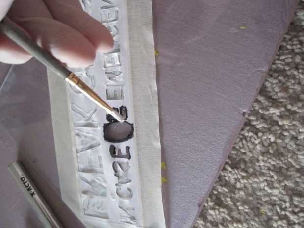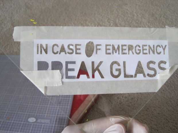 Esta etapa terminó tomando bastante tiempo. Fui en línea y encontró un sitio web que usted puede escribir texto en y producirá en diversas fuentes. Tuve suerte que era la fuente de la cubierta. Imprimí mi texto y utiliza la cuchilla xacto para recortar las letras para hacer una plantilla. Una vez que había recortado la plantilla había colocada a en el cristal y pegadas con la cinta adhesiva. Luego he pintado las Letras con la pintura blanca. Lamentablemente, la pintura manchada y necesita para limpiarse con la hoja del cuchillo. Después de que la pintura se secó, usé una toalla de papel para limpiar algunas de la pintura para darle un aspecto envejecido y angustiado.