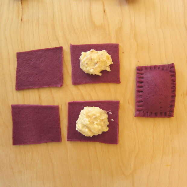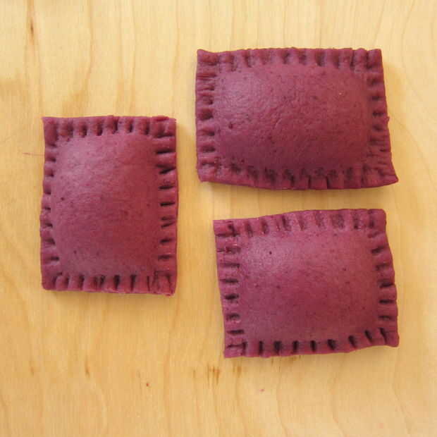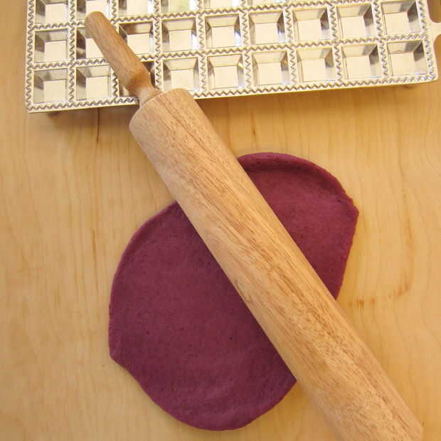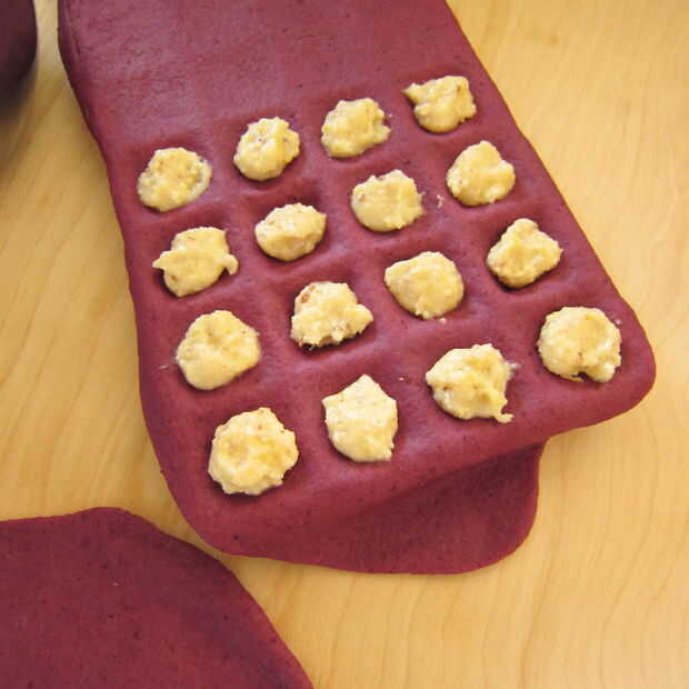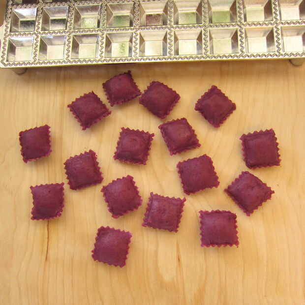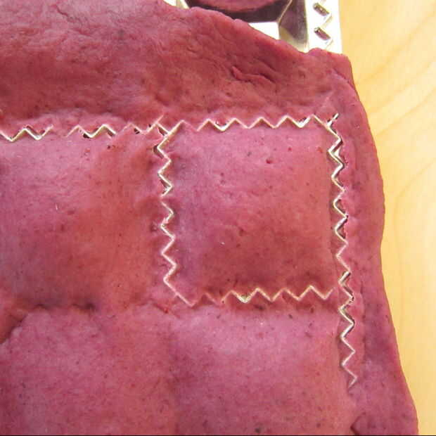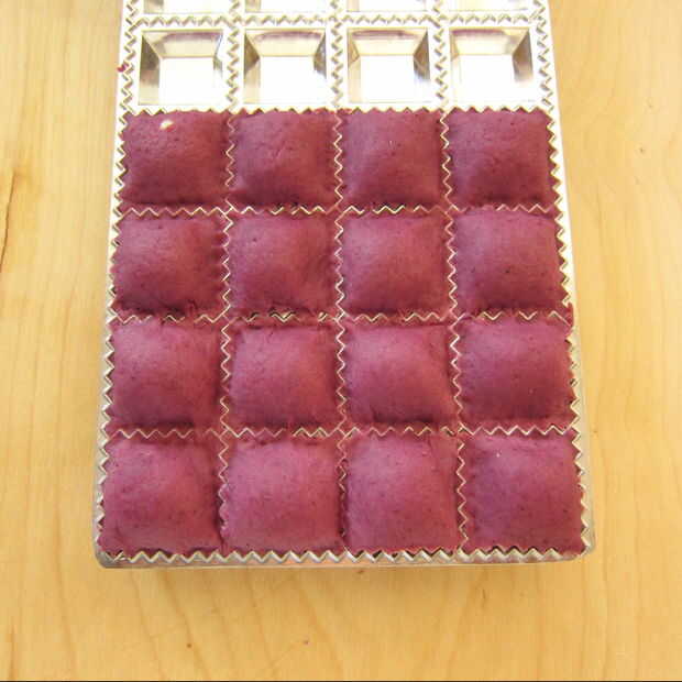 Pulse las costuras hacia abajo con los dedos hasta que la muestra de las costuras y se cortan los raviolis. Voltee el pan y golpee suavemente para soltar los raviolis.