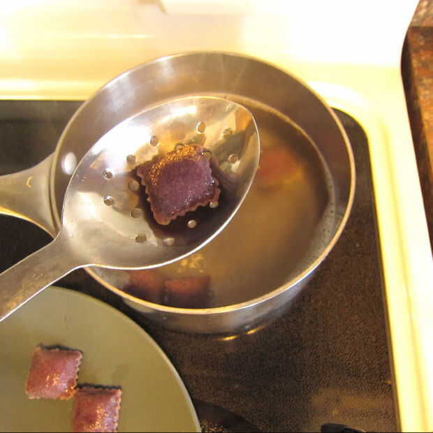 Retire los ravioles con una espumadera drenaje tanta agua como sea posible.