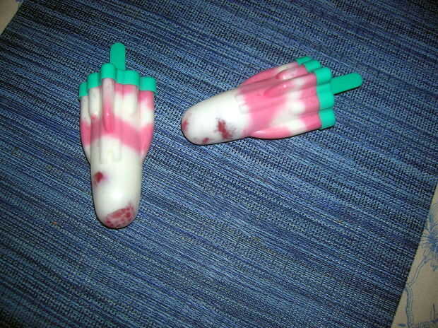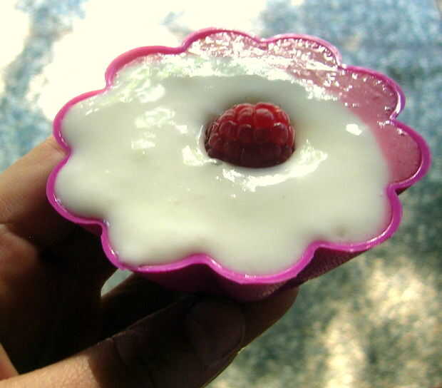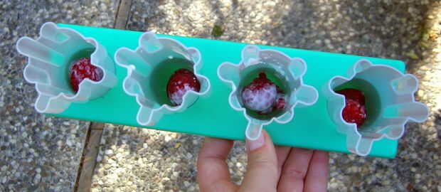 Salvar algunas de las frambuesas para la decoración. Puse dos en la parte inferior de cada uno de mis moldes de paletas.