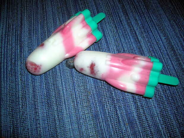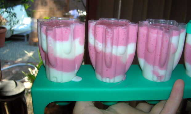 Verter alternas capas de yogurt de frambuesa y frambuesas no se mezcla en los moldes de paletas. Congelar!