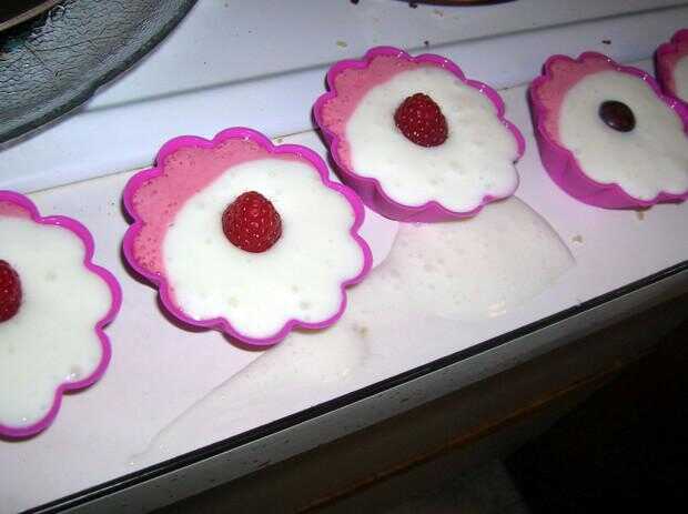 Para hacer las tazas de yogurt congelado, usar moldes de Magdalena de silicona, verter una fina capa de frambuesa en el fondo y verter el yogur blanco de un lado. Hace esta deliciosa media luna! Decorar con una frambuesa antes de congelarlos.