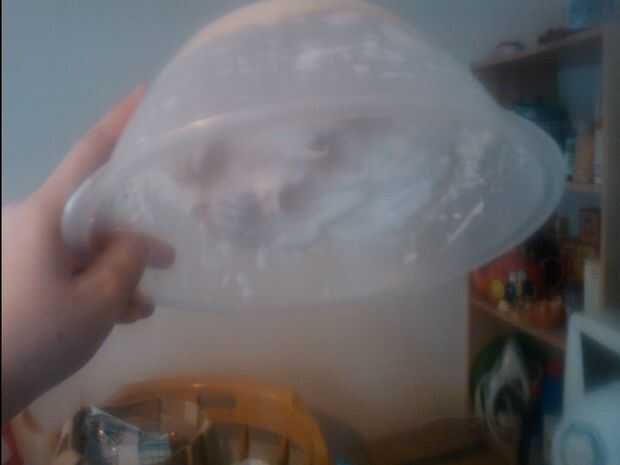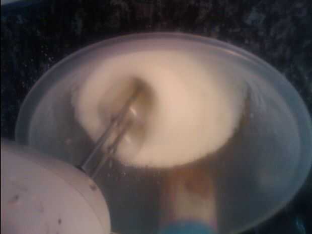 -En un recipiente aparte, batir 3 claras de huevo con un batidor de mano de huevo, hasta que formen picos.