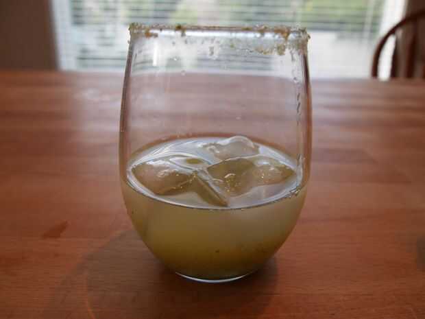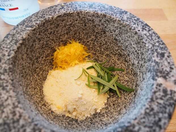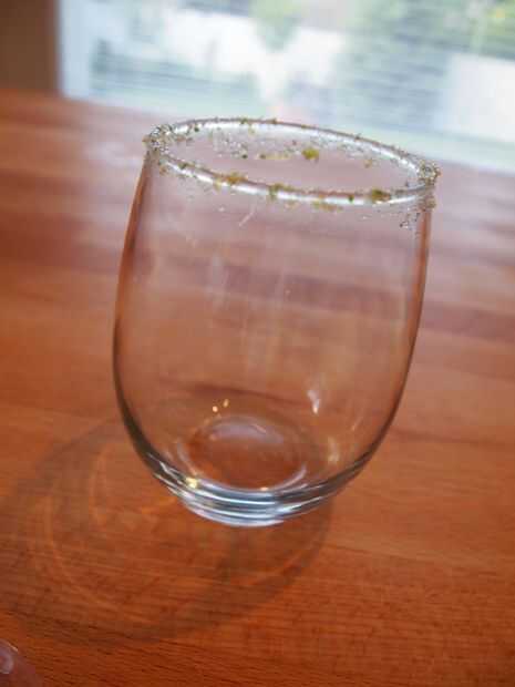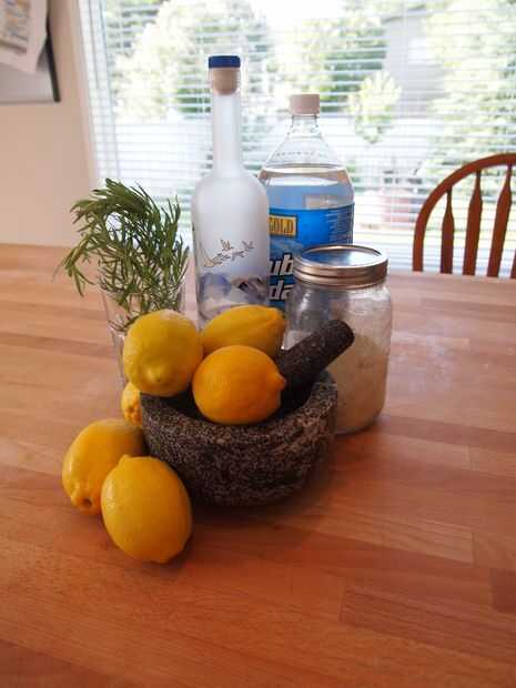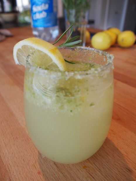 Poner el azúcar, Romero y limón zest en el mortero y maja (o procesador de alimentos) y mezclan hasta el Romero y limón se incorpora. Borde de su vaso con la mezcla de azúcar y luego agregar el jugo del limón. se mezclan esto hasta que el azúcar haya disuelto. Esto le dará aproximadamente 5 cucharadas de líquido por la bebida. Añadir al vaso, añada la cantidad de licor que quisiera y rematar todo con hielo y agua de soda.