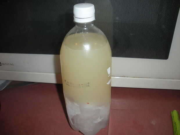 Como se puede ver reutilizar las botellas de cuarto de galón llenándolos aproximadamente 1/3 completo y congelarlas. Rellenar sobre otro 1/3 con agua embotellada (el agua del grifo es desagradable) y luego añadir un 1/8 de cucharadita de jengibre en polvo, añadir una tapa llena de ACV y una gorra llena de jugo de limón y luego unas gotas de salsa picante en el paquete de flavorent (se significa para 16 oz botellas pero creo que es demasiado fuerte así) y agite bien , añadir en el agua con sabor a cereza carbonatado y disfrutar de un saludable limonada cereza
