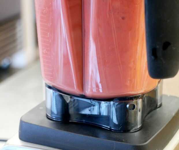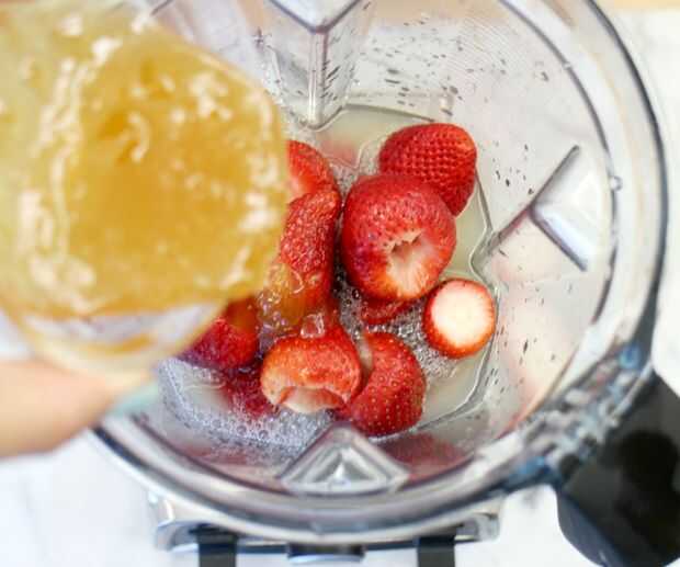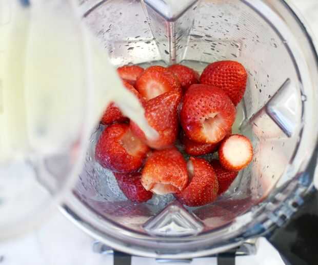 En la licuadora, agregue las fresas, el jugo de limón y el edulcorante.