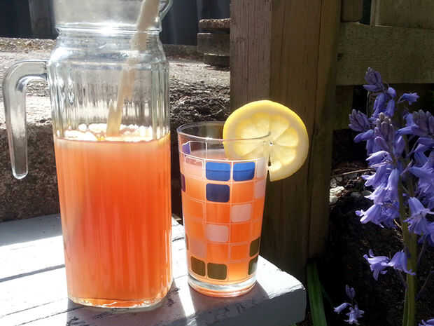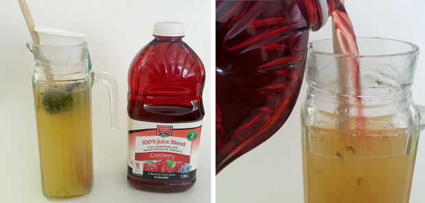 No pude encontrar ninguna rosa medias cercanas al hacer mi limonada, por lo que había teñido con un chorrito de jugo de arándano rojo. Añadir como mucho arándano como lograr el color deseado. La amarga acidez del jugo de arándano rojo complementa muy bien la limonada azucarada. Después de agregar el jugo de arándano y hacer su limonada rosa Coloque la jarra de limonada en la nevera a enfriar.