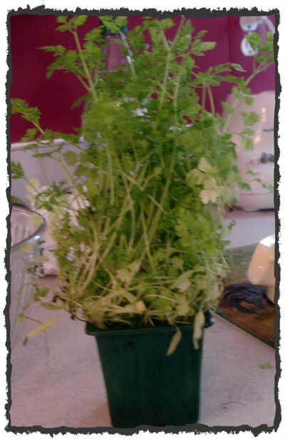 Ahora a traer el perifollo. Perifollo es también conocido como perejil francés por una buena razón como se parece a un perejil delicado encaje. Sin embargo, tiene un poco de un sabor de la albahaca a él. Es un sabor muy delicado y muy sutil. Por lo tanto, vamos a incorporar sus sutiles sabores terrosos en el dulce/amargo limonada de sandía para cortar a través de la dulzura un poco.
