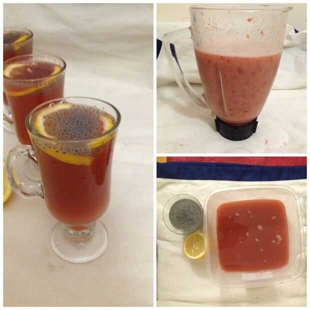 Vierta el jugo en la porción de cristal. Decorar con semillas de albahaca empapada y gajos de limón.