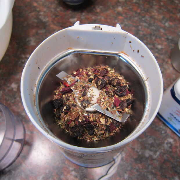 En una amoladora de la especia - té de arándano bliss de moler y reservar. Repita con el té de fresa limonada y apartar.