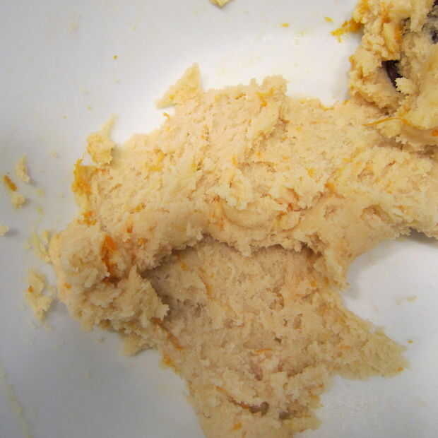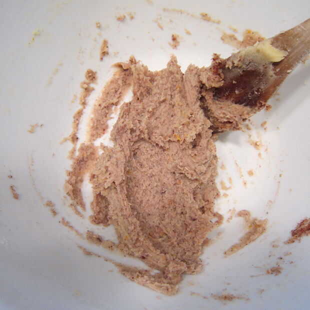 A una mitad de la masa añadir ralladura de naranja y té de planta arándano bliss. Mezcla bien para incorporar.