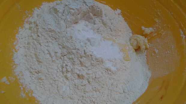 Mezclar 3 tazas de harina para todo uso y 1 cucharadita de bicarbonato de sodio
