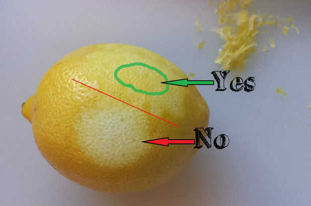 Cuando "ralladura" los limones para quitar sólo la parte amarilla brillante del limón sin que ninguno de la corteza blanca. Si cualquier parte de la médula va a su lote el sabor será demasiado amargo, sin dejar de mencionar que el color será apagado.