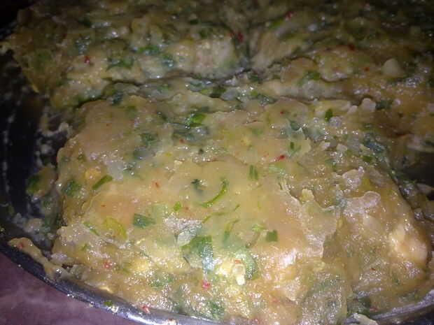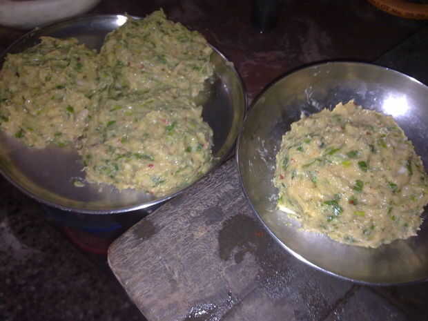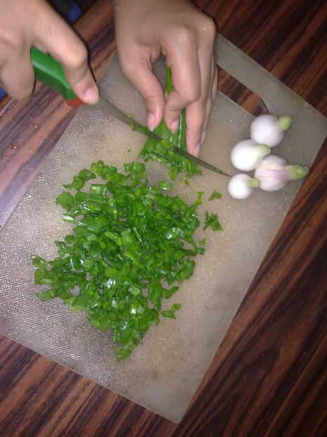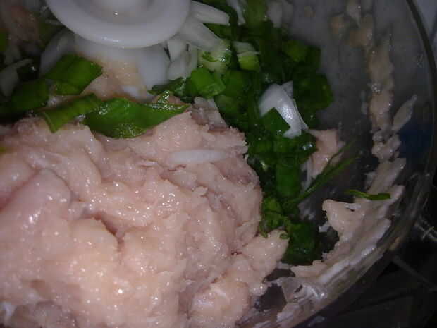 poner el pollo en la licuadora o procesador de alimentos y mezcla hasta más o menos picados. Añadir las cebolletas, ajo jengibre y puré de hierba de limón.