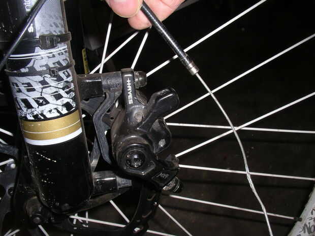 Retire el cable en el freno y en el punto 1/2 camino la horquilla hay otra pinza que sostiene el cable fuera de la rueda. Remueva estos para que pueda deslizar el encogimiento del calor en.