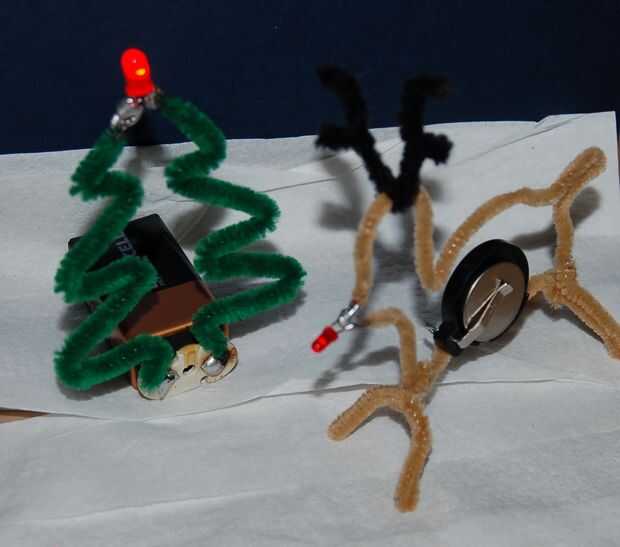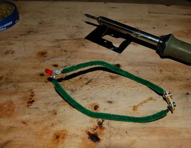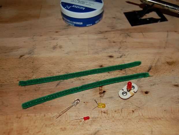 Unsoldered el LED del conector y otra vez quemar las fibras de los extremos de los limpiapipas soldar el conector de batería para los limpiadores de pipa y luego el LED rojo. El último paso fue doblar el limpiador de pipa a la forma de un árbol de Navidad. Doblando el limpiador de pipa 90 grados la batería se ponga de costado para que el árbol no sería demasiado alto de la tabla.