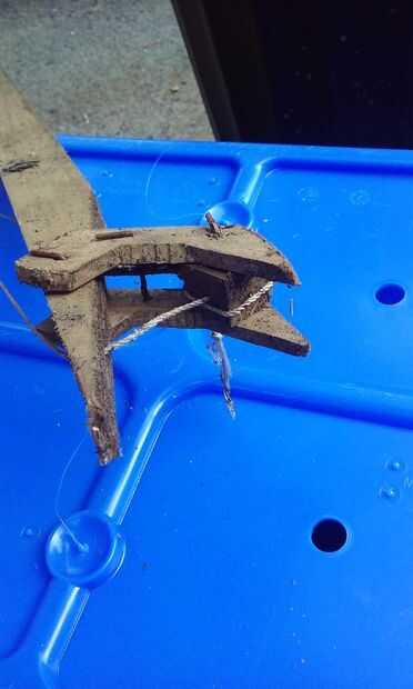 4) como se muestra en la segunda foto, sujete los lados de la mandíbula y bloque con tres pedazos de alambre de colgador de ropa. Se pueden utilizar tornillos, pero me temo que va a venir sueltos como la madera se moja.