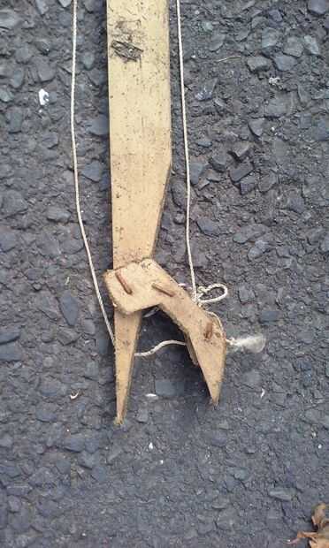 1) tomar tres piezas de 1.5" enrejado desmontaje 6.5' largo y corte un punto en un extremo que es 6" de largo. Puede enlazar el desmontaje con tornillos, piezas de alambre de la percha, etc.. Usé pegamento de madera y no aguantar en la tubería húmeda. Perfore un agujero a través del medio de extracción cerca de 1.5" o lo de la punta. Se puede ver la cadena va a través del agujero en la imagen izquierda.