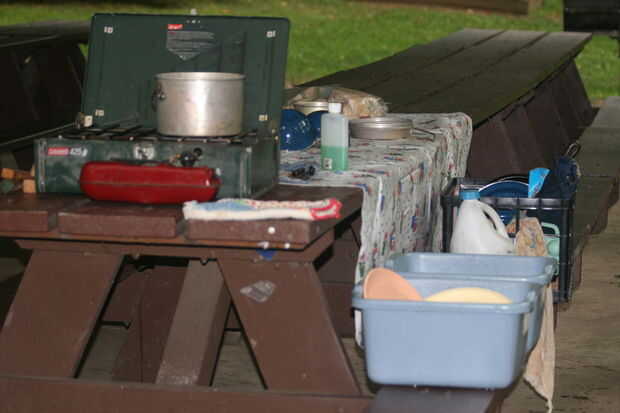 Ya que cocinamos nuestros platos en un Coleman estufa, tan pronto como uno de los quemadores es disponible, Calentamos una olla de agua (agua sólo tiene que estar caliente, no es necesario que hierva) a utilizar para lavar los platos. Cuando que hemos terminado nuestra comida, el agua es caliente y listo para usar.