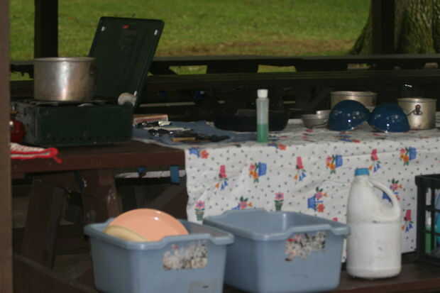 Después de la comida, se inicia la línea de montaje de limpiar. Añadir agua fría a cada cuenca. Algunos contenedores de plástico se pueden derretir si hirviendo o muy caliente se le añade agua primero; nunca hemos tenido un problema mediante la adición de agua fría antes de la agua caliente. A continuación, añadir agua caliente a ambas cuencas, más agua caliente en el recipiente utilizado para lavar los platos, además de jabón líquido para platos y una cucharadita de Clorox (ayuda a desinfectar platos) a este compartimiento.