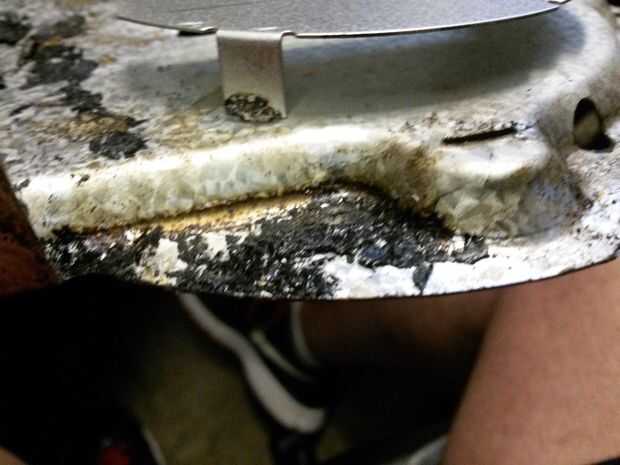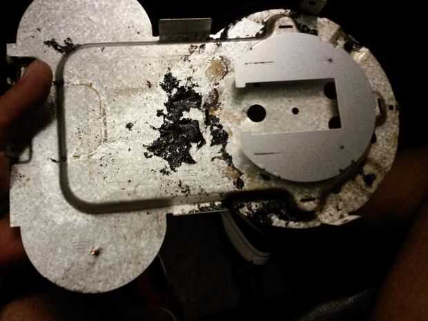 Mina como se puede ver, era completamente desagradable. Esto fue causado por el café se derrame sobre la unidad y se le permitiera cocinar apagado. Esta acumulación es escamosa, por lo que se fuera con el mínimo esfuerzo. Observe que la base metálica de acero galvanizado por lo que el residuo no se adherirá a ella.