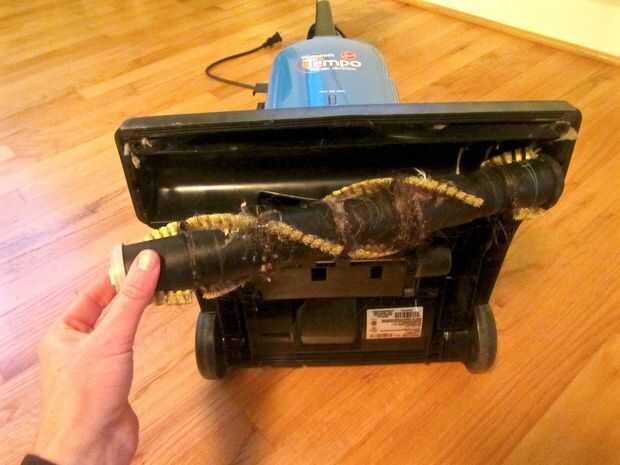 Una vez que la placa inferior está apagado usted fácilmente puede saltar su cepillo de rodillo. Generalmente uno de los extremos se deslice hacia afuera y tire del cepillo del rodillo de la correa. Recuerde mirar a tomar nota en cuanto a la orientación de su cepillo de rodillo. Esto hará que sea más fácil volver a poner una vez que haya terminado de limpiarlo. Si el cepillo no saltando fácilmente tratar de girar hasta que se desliza hacia fuera.