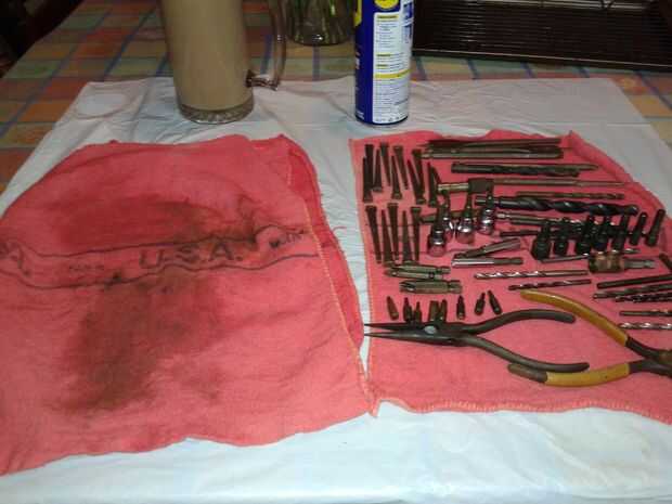 Rápidamente solicité WD-40 para todas las herramientas. Con un trapo para asegurarse de que el aceite se metió en todos los rincones y grietas. Asegurarse de trabajar aceite en las piezas móviles como las articulaciones de pinzas y el collar de la broca de liberación rápida.