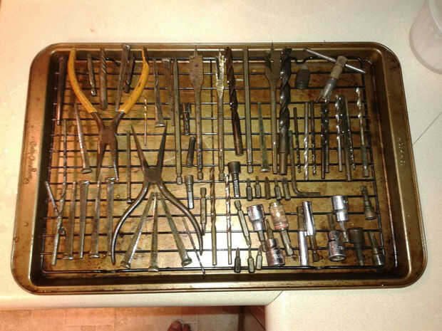 Puse el horno en caliente (170 F) y extiende las herramientas en una rejilla para enfriar encima de una bandeja para maximizar el secado.