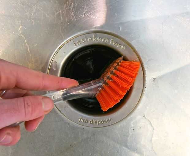 Utilizar el cepillo o cepillo de dientes viejo, limpiar la parte exterior de la mayoría de la basura con un poco de jabón. Enjuague cualquier espuma de jabón o residuos restantes abajo la disposición con agua caliente del grifo.