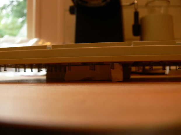 Así que ahora la pieza previamente residuos bandeja y todas las llaves son como nuevo y listo montar de nuevo. Como se puede ver en la imagen, los resortes reinsertados salir como marineros en licencia, por lo que necesita apuntalar el teclado para darles cierta holgura como usted harían con marineros reales. Me acaba de pasar que unos trozos en forma de L de corte azulejo sentados; puede utilizar libros o legos o lo que sea, pero si el teclado se cae y los resortes son empujados hacia fuera, es una plaza! Estar prevenido.