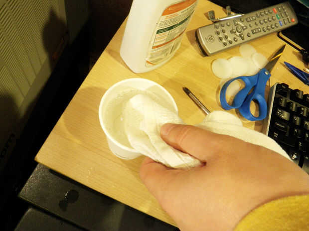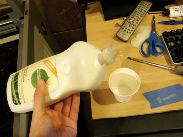 Vierta agua destilada en un vaso y coloque una gota de detergente suave para platos. Marcas medio ambiente tienden a trabajar bien.