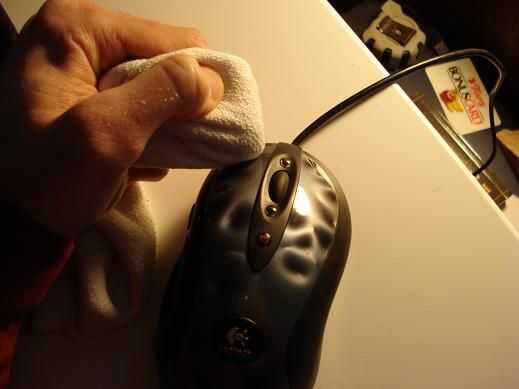Primero quiere limpiar la parte superior del ratón donde descansan los dedos. La mía es usaully realmente bruto porque comer en mi ordenador. Para limpiarlo, simplemente coge un trapo, o un calcetín viejo y darle una buena limpia. Si la superficie de su ratón es brillante, debe com off bastante fácilmente, pero si no, puede utilizar un poco de agua. Si está realmente atascado en, poner unas gotas de agua en él y dejarlo reposar unos minutos, luego volver e intentar raspar apagado. Uñas para pegado en líos así.