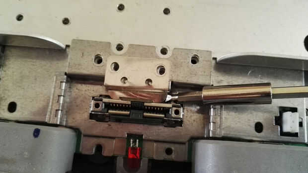 Tomar todos los tornillos fuera... todos los millones de ellos. es broma, tipo de... pero quitar cada tornillo. Organizar a todos ellos y los disipadores de calor de metal y blindar apagado hasta que te queda sólo la Junta. Poner en marcha el compresor y soplar la Junta limpia. El contacto del cartucho puede limpiarse con un kit de limpieza especial o simplemente una toalla de papel con algún removedor de esmalte de uñas.