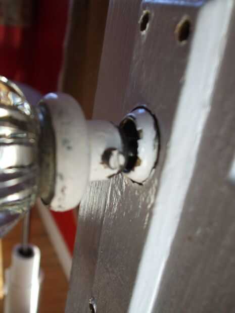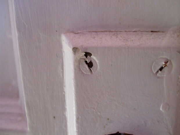 2) si es necesario, utilizar el cuchillo para quitar la pintura de las cabezas de tornillo de la perilla y placa - a bastante el obtener el destornillador. El pin también puede ayudar.