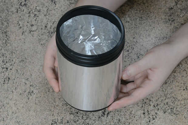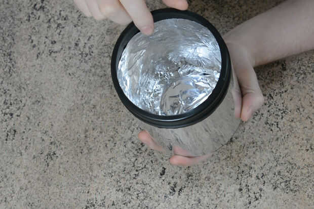 Ahora medir y cortar dos hojas rectangulares de aluminio, lo suficientemente grande como para envolver dentro y fuera de su envase, estos deben superponerse ligeramente. Luego puede poner aluminio en las paredes internas y externas y pegarlos en su lugar. Asegurar que la conexión de la pared interna superpone a la sección de base. También asegúrese de que su papel de aluminio es agradable y plana contra la superficie, retire cualquier bolsas de aire cuando sea necesario.