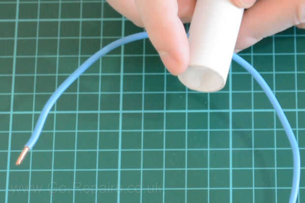 Ahora su frasco está listo es hora de cargarlo. Por que vamos para hacer lo que estamos llamando una barra de energía, esto tanto de carga y descarga el condensador. Comenzamos por cortar una longitud de tubo de PVC, también corte un pedazo de alambre y los extremos de la tira. Ahora hacer un agujero justo en el tubo lo suficientemente grande para encajar el alambre a través en uno de los extremos y el hilo de rosca del alambre por el agujero.